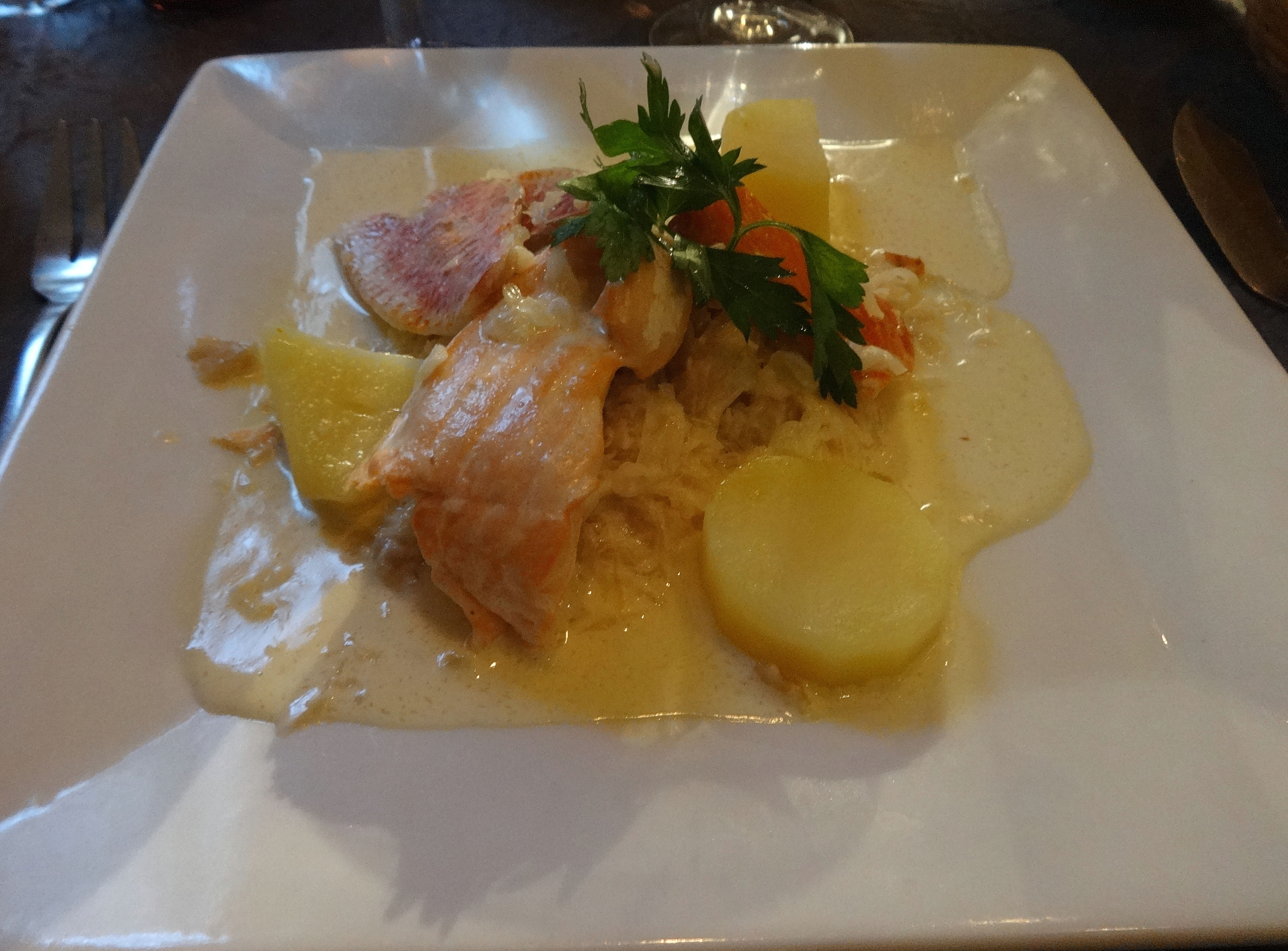 I had one of my best meals with friends in Montmartre – I found a gem beforehand online, and based on the reviews we made a reservation at Le Sagittaire (77 Rue Lamarck, Montmartre). The 32 euro prix-fixe menu includes an Aperitif, Starter, Main course, Salad, Cheese Course, Dessert, Coffee, AND 1/2 a bottle of wine per person. An absolutely unbelievable deal in any city, nevermind Paris, and the food was outstanding. The evening we went, starter choices included escargot, scallops with quinoa & apple salad, or confit de canard. Main courses ranged from Steak Frites to traditional French Choucroute (delicious, pictured below) and dessert could be a chocolate mousse cake, flambeed banana crepes, or “Floating Islands”. Between three courses, along with cheese, salad, and drinks, we were all stuffed and wondering how on earth they can provide such wonderful food for such a small price. AMAZING!