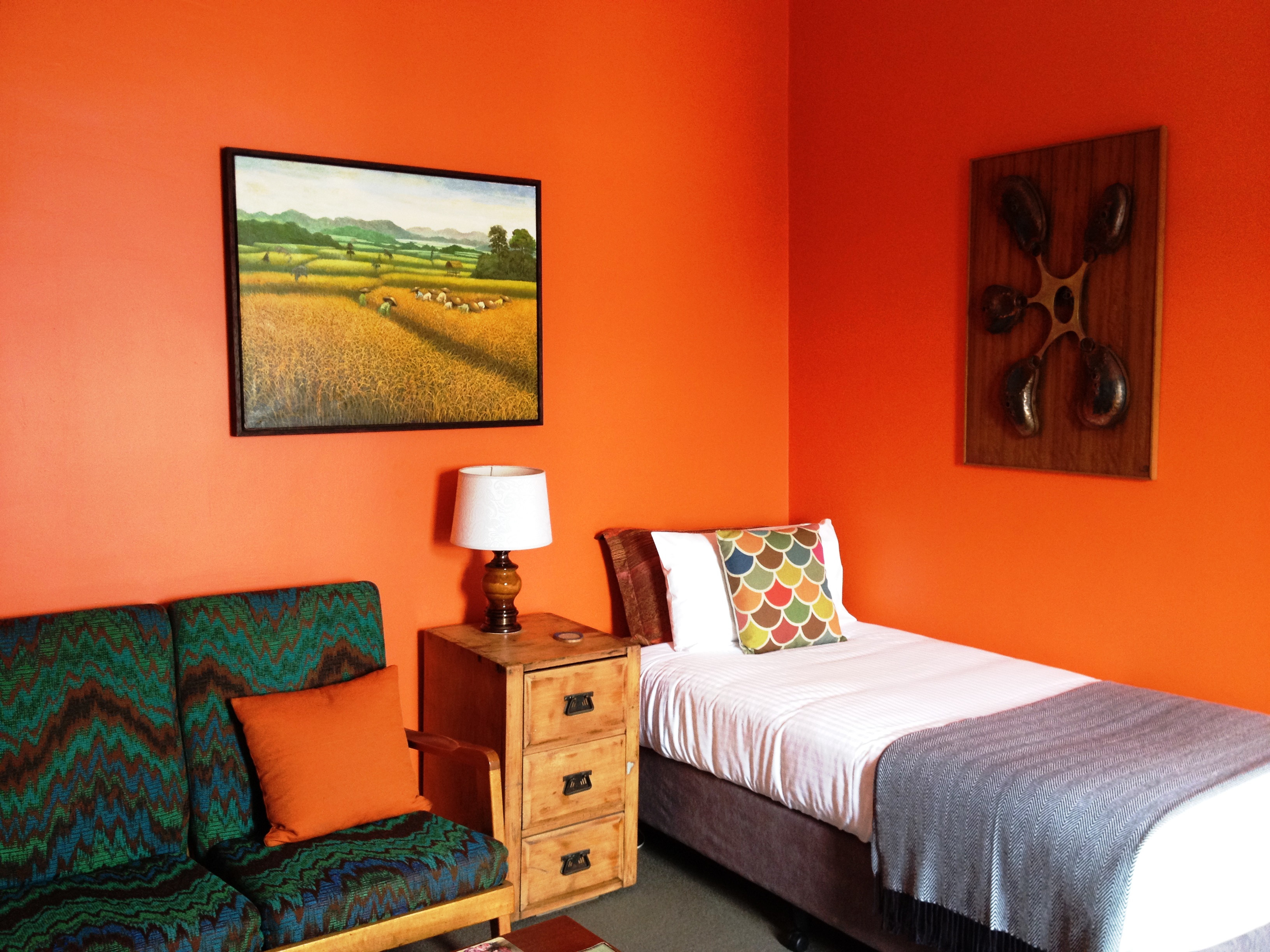 The next day, thankfully some stores were open again and we felt a little more in touch with society. Our drive took us a bit inland to experience Australian wine country – and an absolute GEM of a hotel, our favourite on the trip. Vine Valley Inn is situated in the sleepy town of Cessnock – truly nothing much goes on there besides tourists being picked up by shuttle buses to go to the wineries. Anyway, Vine Valley Inn is up a set of unassuming stairs, which reveal a complete other world when you check-in. The Inn is totally outfitted in a funky retro style, which may sound horrible but the way the owners decorated is just so totally cool, sleek, and somehow modern. Each room is completely unique, with individual paintings, pillows, bedspreads, and perfect little touches like retro trays, mirrors, glass vases, and tiny details that bring everything together. Luckily we were early to check-in so we got to snoop in all the other rooms while walking down the hall to ours. My favourite had a huge refinished wooden door as a headboard, and cute animal pillows.